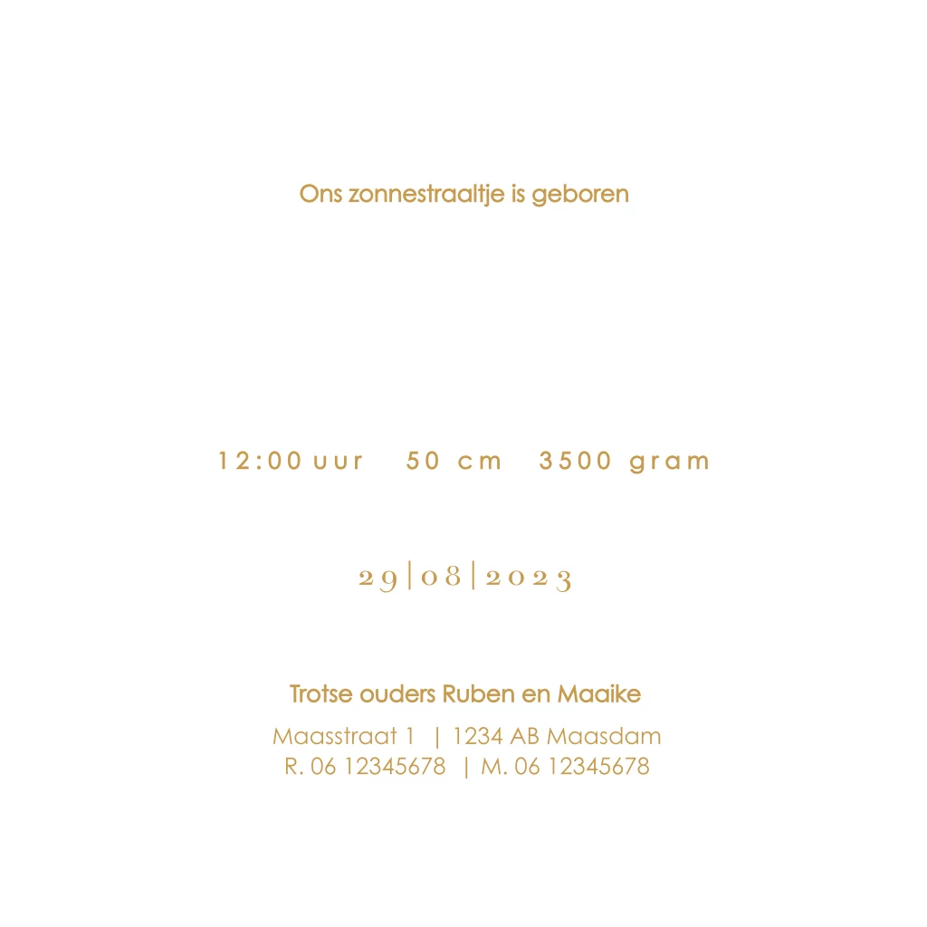 Goed om te weten: dit design bevat een kader. Omdat de kaarten na het drukken op een groot vel pas worden uitgesneden op het juiste formaat, kan het zijn dat het kader íetsje smaller of breder uitvalt. Dit gaat slechts om een paar millimeter, maar we willen het wel graag vermelden.