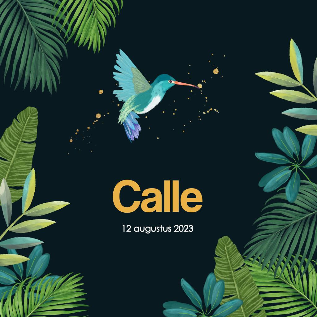 Een stoer en prachtig geboortekaartje zoon met kolibri. We hebben gekozen voor een zwarte achtergrond. Mooi op natuurkarton met lichtblauw envelop en sluitsticker hartje in goud.