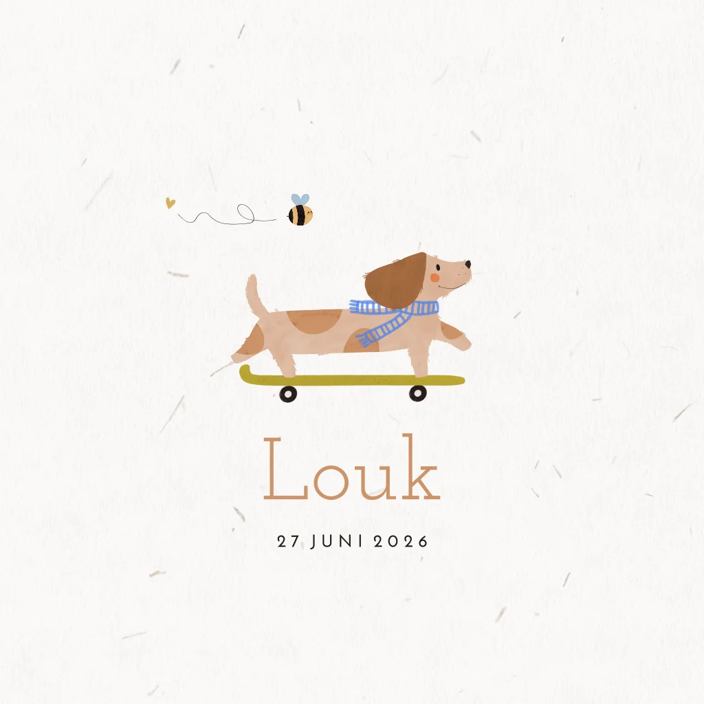 Geboortekaartje jongen vrolijk teckel op skateboard met bijtje