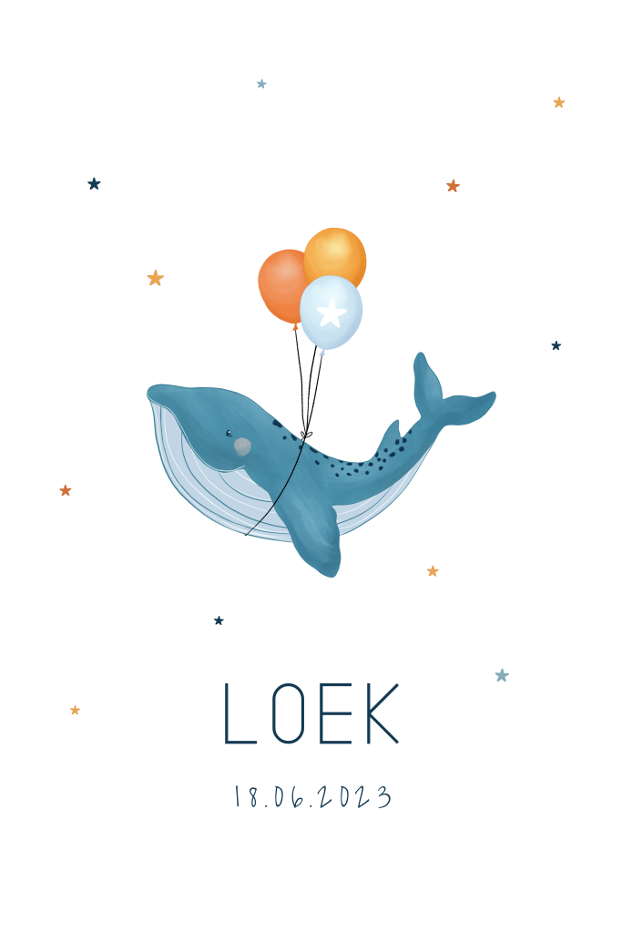 Bij de geboorte van jullie kleine bink, hoort een vrolijk geboortekaartje. Wat dacht je van dit kaartje met walvis en ballonnen?