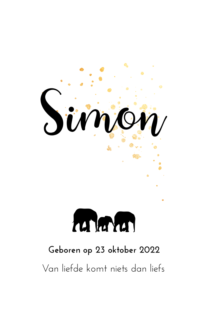 De kracht van dit design is de eenvoud. De hippe gouden verfspetters maken dit zwart wit kaartje met silhouet van olifantjes helemaal af! Combineer deze kaart met de olijfgroene envelop en kies voor de papiersoort oud-hollands. Super gaaf!
