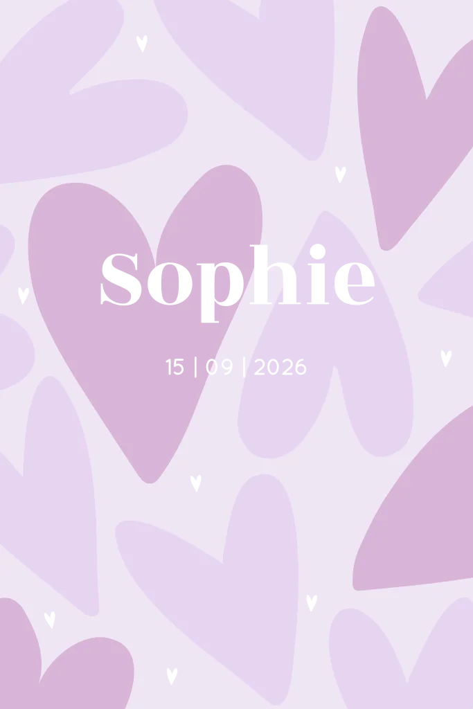 Oh, wat worden wij blij van dit lila geboortekaartje! De letters en kleine hartjes in goudfolie, maken het kaartje helemaal af. Het lettertype of andere elementen pas je gemakkelijk zelf aan in de online editor.