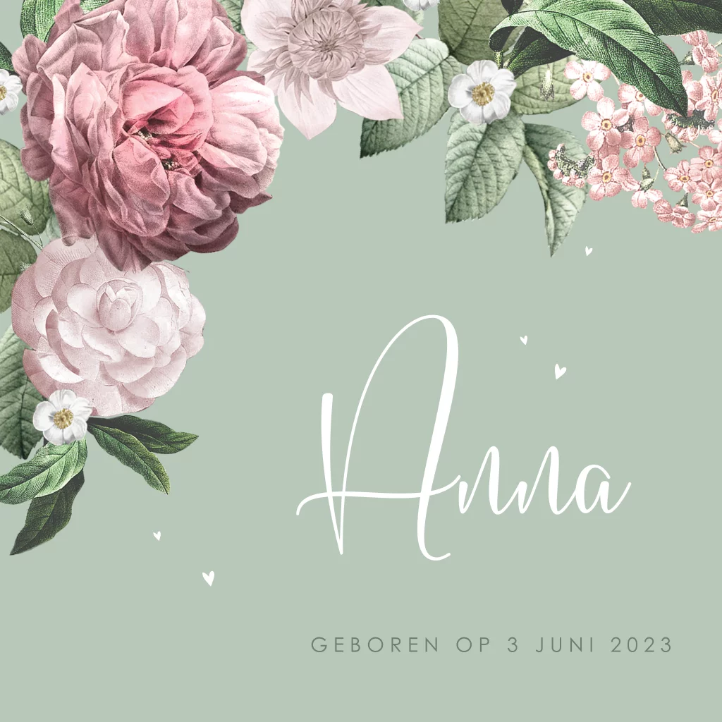 Geboortekaartje meisje bloemen in peach en grijs-groen