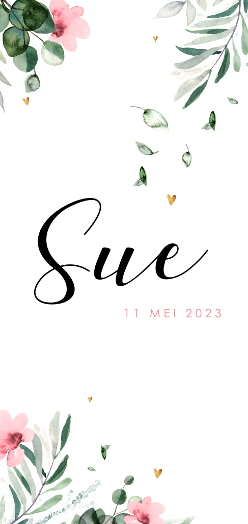 Een clean babykaartje meisje in floralstijl. Mooie grijsgroene blaadjes, roze bloemen en kleine gouden hartjes. Kies bijvoorbeeld voor oud-hollands papier.