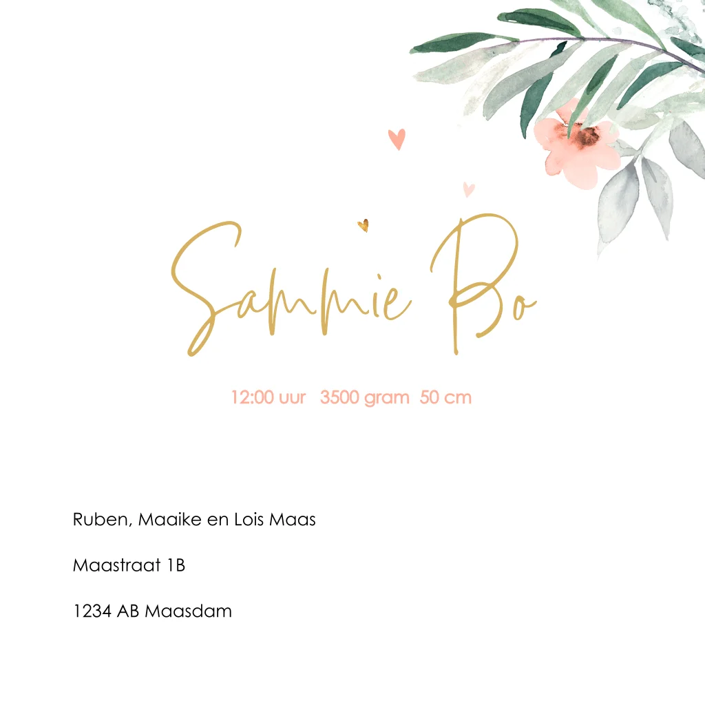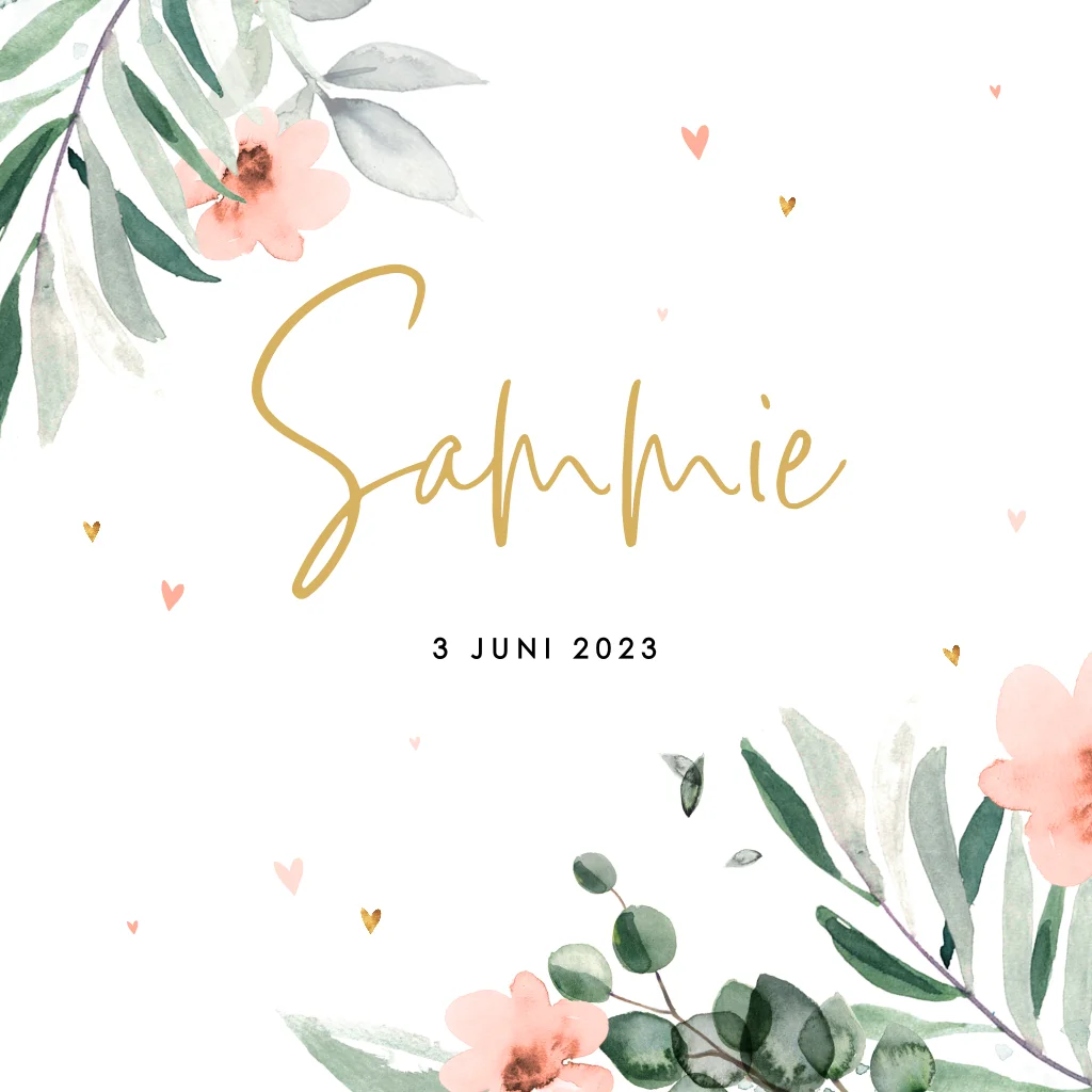 Floral geboortekaartje dochter met grijsgroene bladeren, peach bloemen en lieve kleine hartjes.