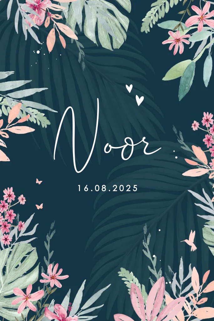 Lief en stoer geboortekaartje voor een meisje. De combinatie van de donkerblauwe achtergrond en vrolijke watercolour takjes, bloemetjes en hartjes maken het kaartje lief en stoer tegelijk. De letters in rosefolie maken het kaartje extra speciaal. Wist je dat je de rosefolie letters zelf gemakkelijk kan veranderen naar een andere (niet folie) kleur? Ga hiervoor naar de editor.