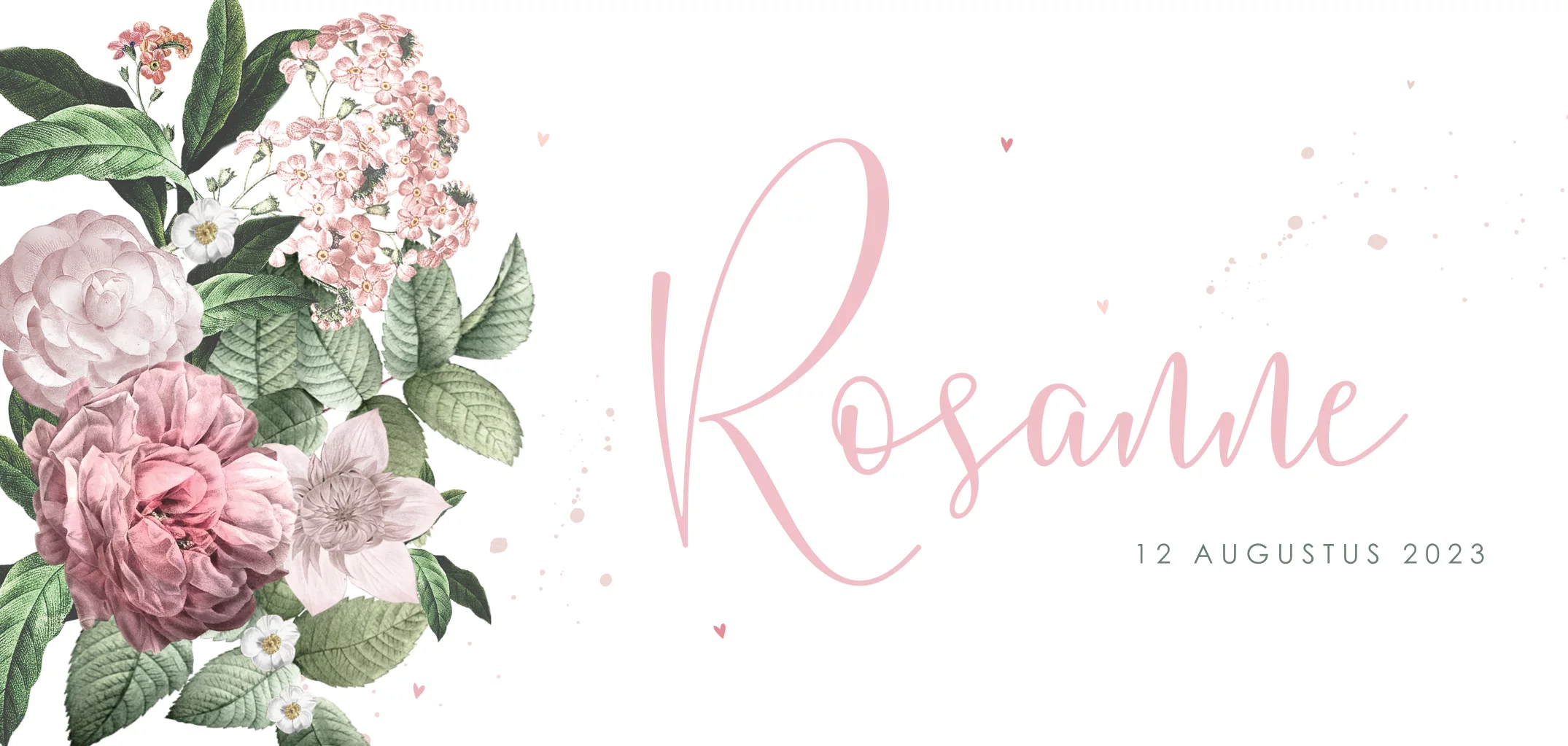 Een geboortekaartje meisje met prachtig geschilderde bloemen in zacht roze met vergrijsd groen. Maak een proefdruk op oud-hollands papier en combineer met een roze envelop. Heel gaaf!