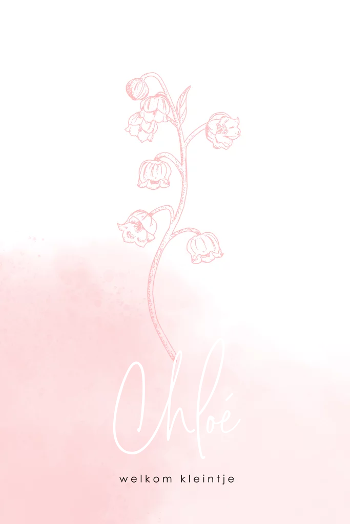 Trend geboortekaartje meisje met geboortebloem. Een originele tekening in zacht roze gecombineerd met watercolor en roségoudfolie. De betekenis van de bloem: het heerlijk geurende lelietje-van-dalen staat voor lieflijkheid en bescheidenheid.