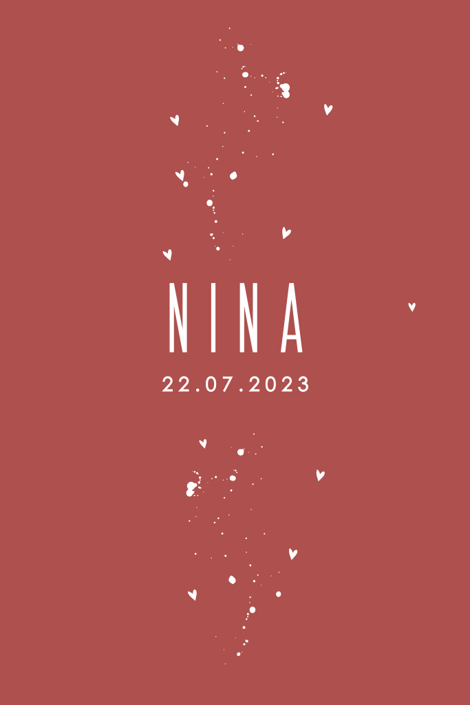 Een stijlvol en luxe geboortekaartje dochter. Wat maakt het kaartje zo bijzonder: de hartjes, spetters, naam en de datum zijn voorzien van goudfolie. Bekijk ook de andere opties folie koper en zilver.
