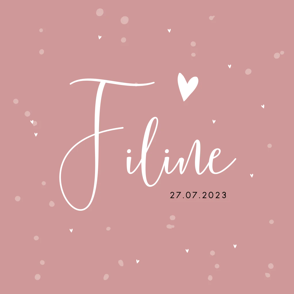 Wat een lief geboortekaartje is dit! Door de mooie roze achtergrond springen de goudfolie letters en het goudfolie hartje echt uit de kaart! Zo bijzonder wordt dit geboortekaartje door de goudfolie. Leuk versierd ook met witte stipjes. Aan de binnenkant van de kaart ruimte voor een foto. Kies voor een bijpassende oudroze envelop en goudfolie sluitzegel.
