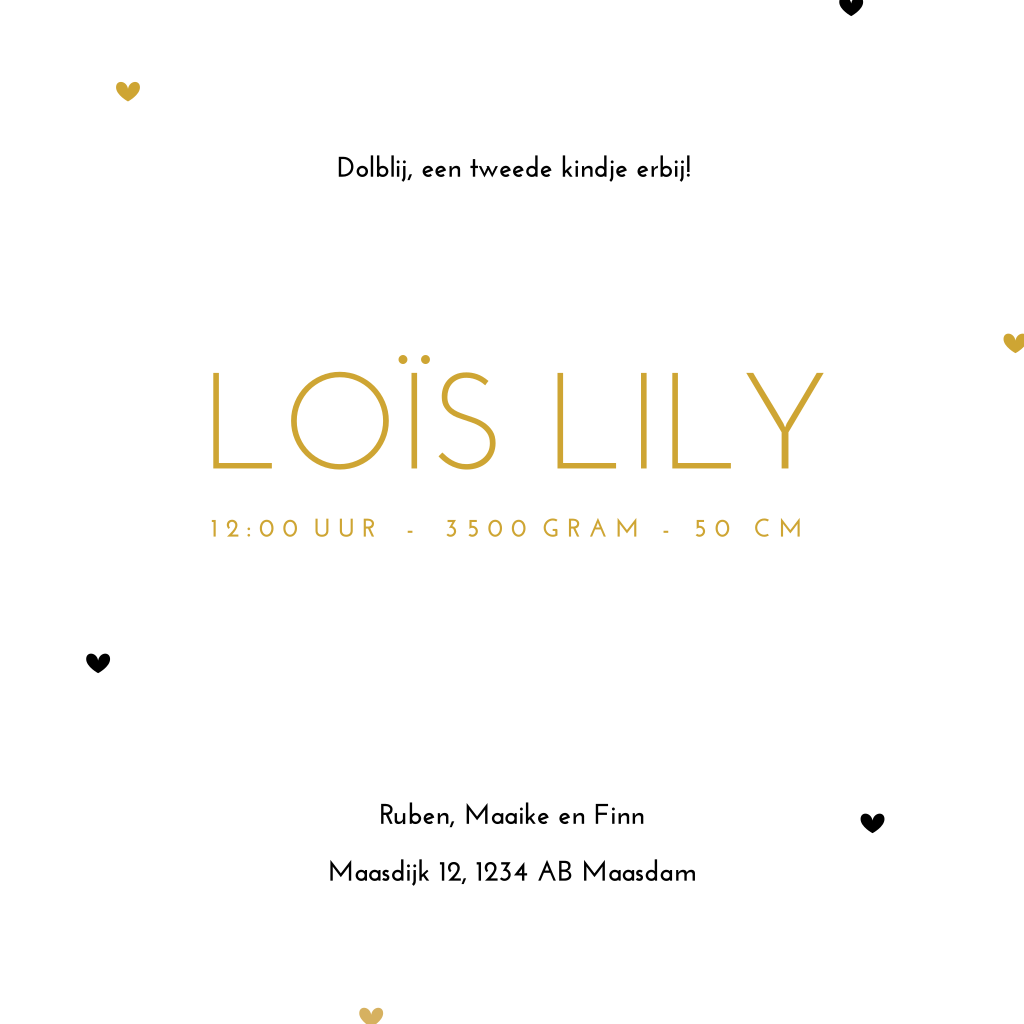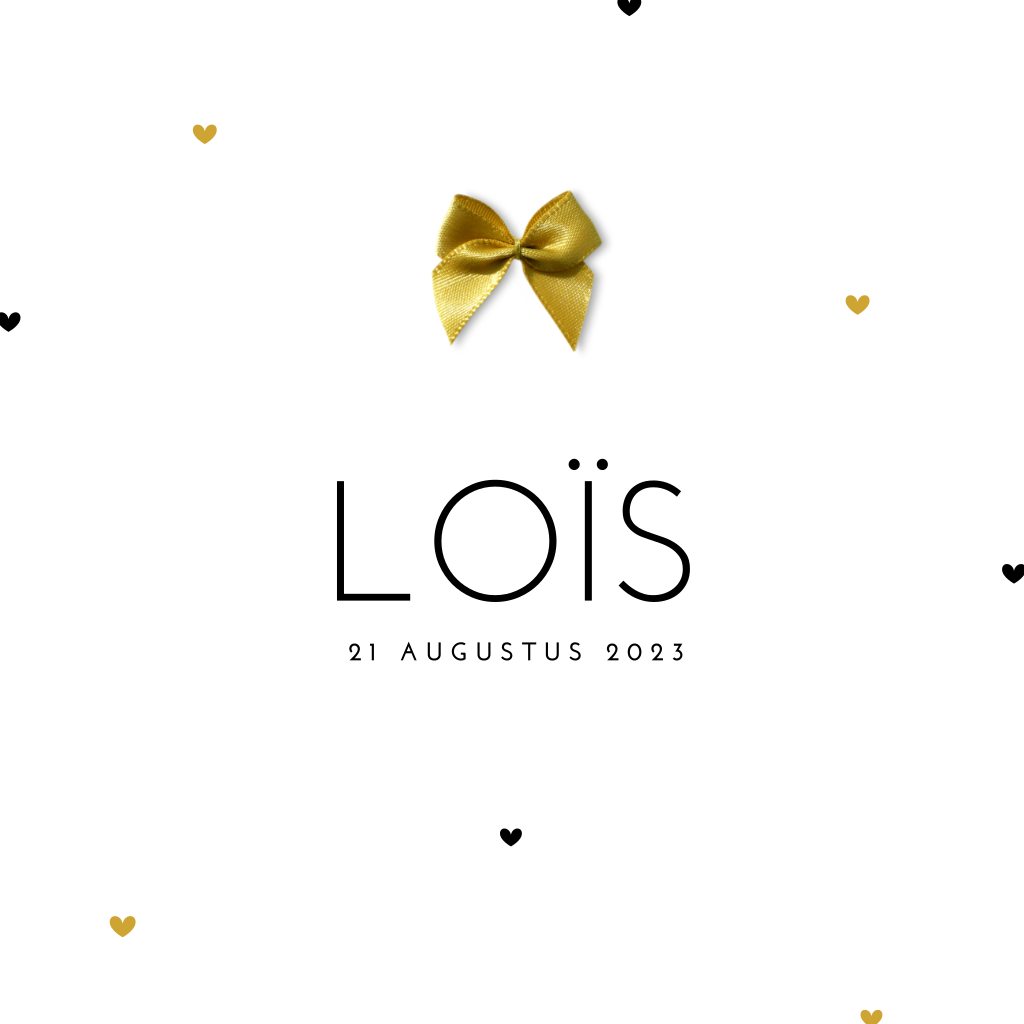 Clean en minimalistisch design geboortekaartje voor een lief meisje met hartjes in zwart en goud en een échte strik. Aan de binnenkant kun je je eigen foto plaatsen.