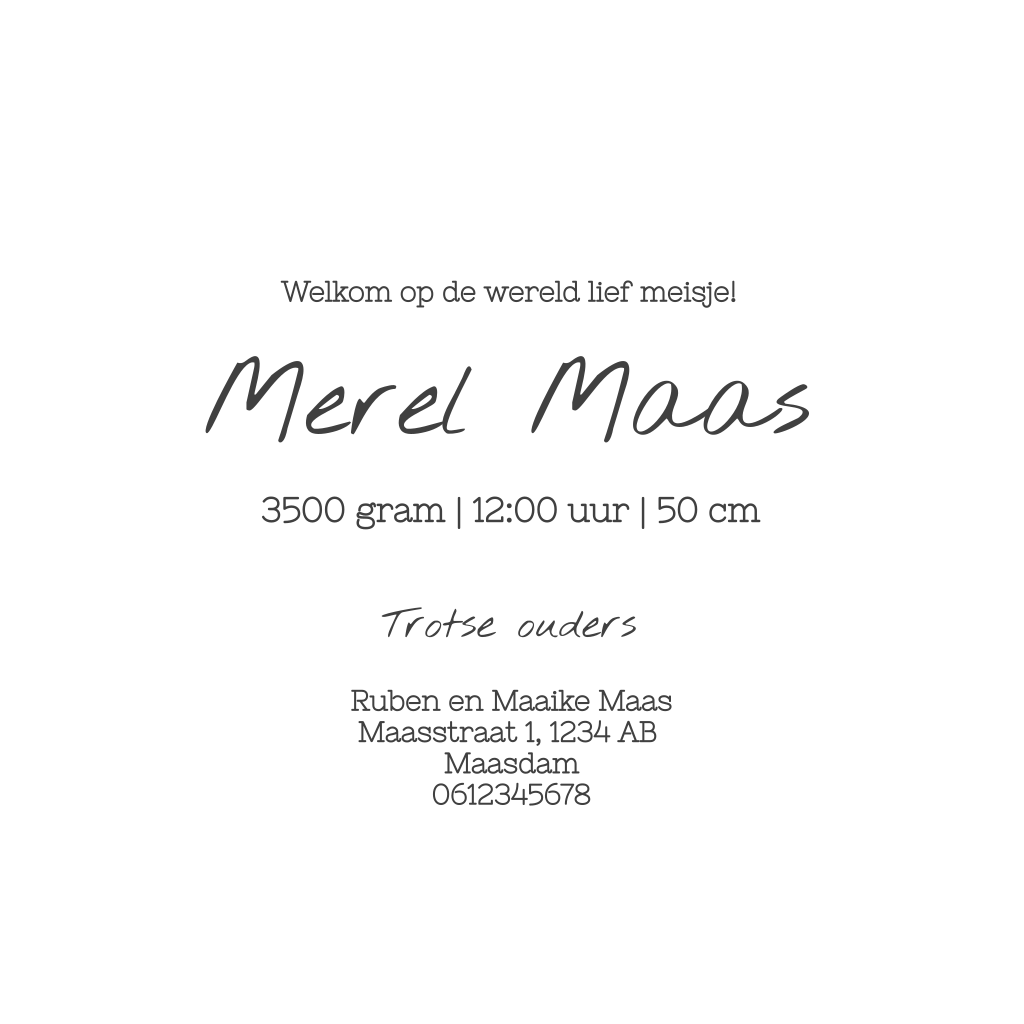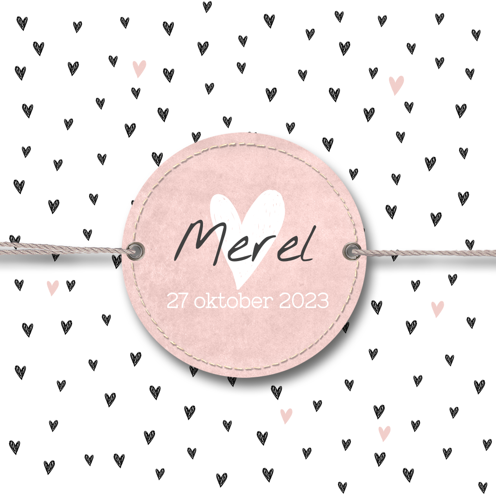 Een lief en hip geboortekaartje meisje met hartjes en origineel label. Mooi op oud-hollands papier met roze envelop.