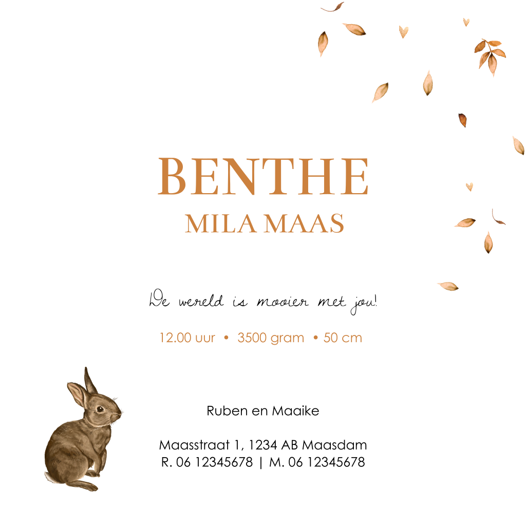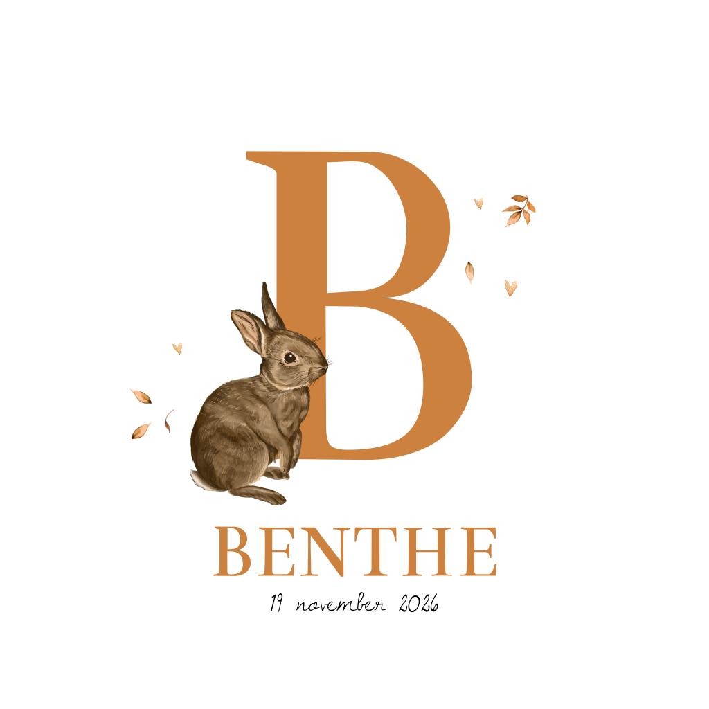 Super lief geboortekaartje voor een herfstkindje, waarbij de voorletter centraal staat. De illustratie van het konijntje maakt het een lief geheel. Dit schattige kaartje kan je naar wens bewerken in de editor.