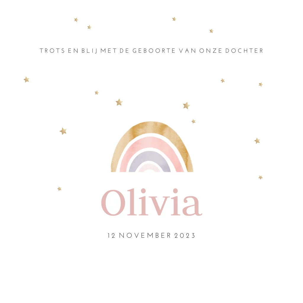 Een klassiek babykaartje meisje met regenboogje in watercolour. Zacht roze, goud en een beetje lila. Clean en klassiek past dit design mooi op de papiersoort oud-hollands.