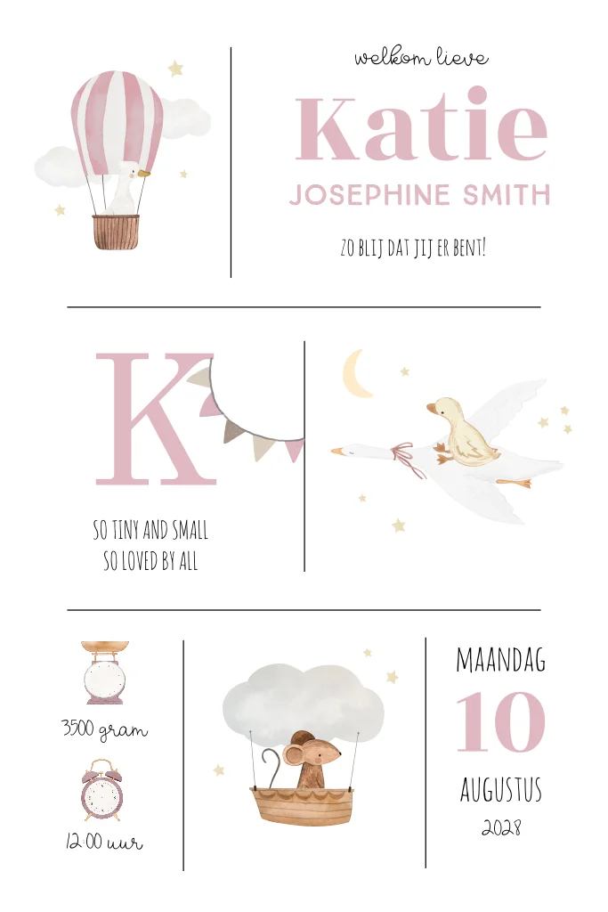 Ga voor bijzonder en kies voor een geboortekaartje waarbij de diertjes en geboortegevens de hoofdrol spelen. De speelse watercolour illustraties en de roze tinten maken dit een onwijs lief kaartje.