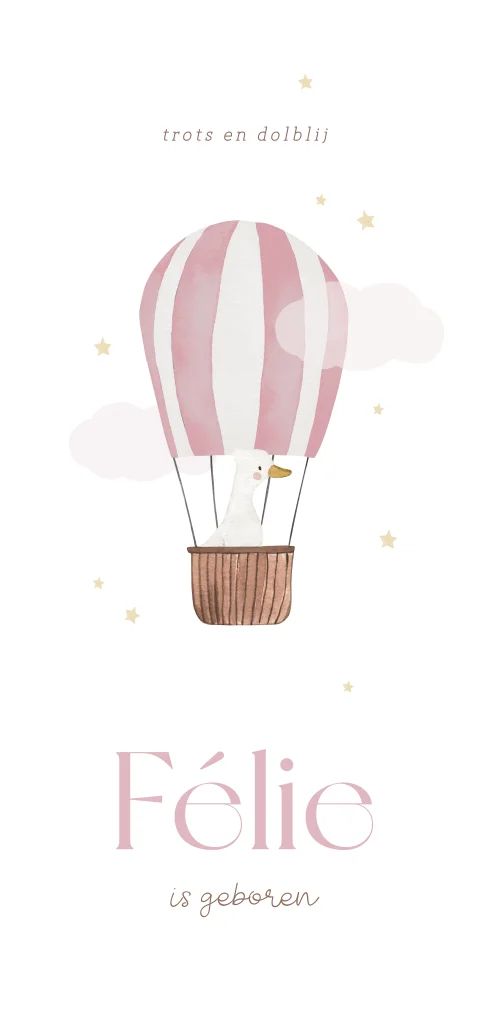 Op zoek naar een schattig en vrolijk geboortekaartje voor jullie kleine meisje? Dan is dit geboortekaartje met luchtballon en gansje precies wat je zoekt! Je past gemakkelijk kleuren, lettertypes en andere elementen aan met de online editor.