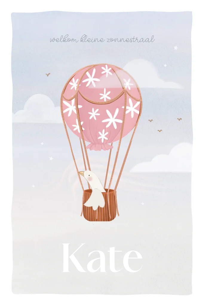 Op zoek naar een schattig en vrolijk geboortekaartje voor jullie kleine meisje? Dan is dit geboortekaartje met luchtballon en gansje precies wat je zoekt! Je past gemakkelijk kleuren, lettertypes en andere elementen aan met de online editor.
