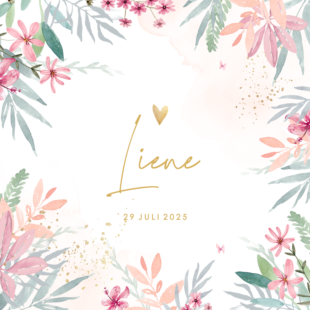 Prachtig en vrolijk geboortekaartje voor een lief klein meisje. De mooie botanische bladeren en takjes in combinatie met de felroze bloemen zorgen voor een volijk geheel. Perfect voor een kindje in de lente, zomer of nazomer.