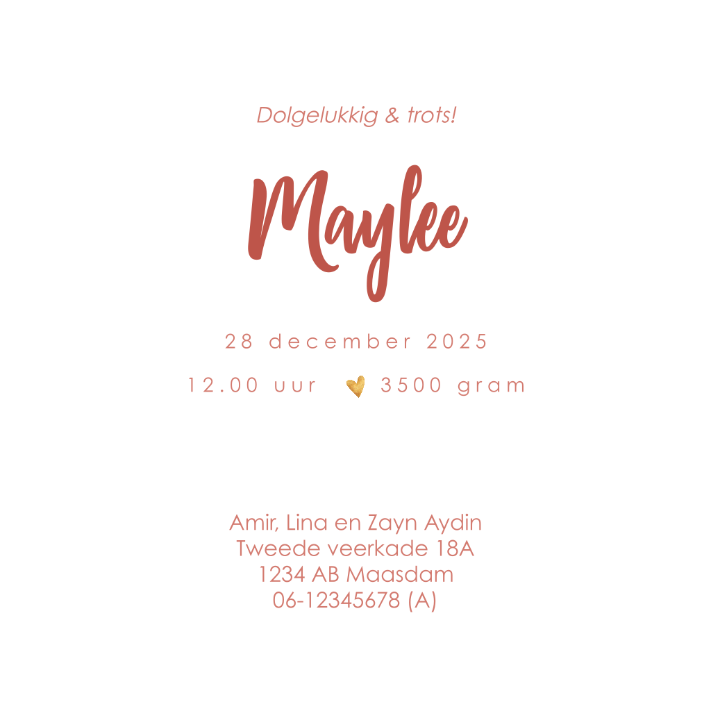 Dit gave geboortekaartje met gouden hart is de favoriet van ontwerper Marieke. Wat dit kaartje zo bijzonder maakt? Dat is de achtergrond! Die kun je namelijk zelf helemaal aanpassen qua kleuren!