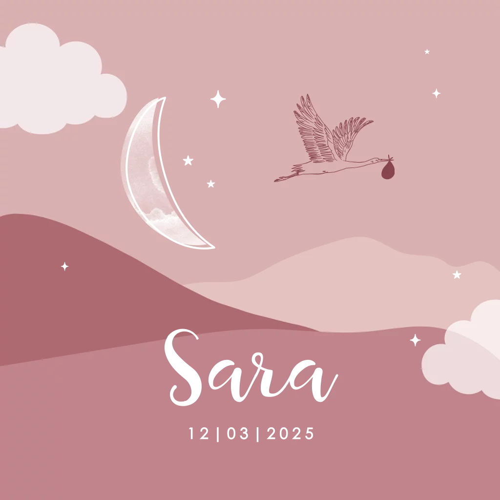 Onwijs lief geboortekaartje voor een meisje. Waarin super hippe elementen, zoals de maan, sterren en de horizon, worden gecombineerd met authentieke illustraties als een ooievaar en wolkjes.