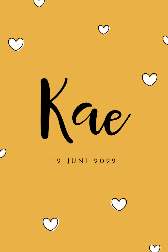 Hip, simpel geboortekaartje voor een meisje met trendy okergele achtergrond met witte getekende hartjes. Pas kleuren en lettertypen naar wens aan in de editor.