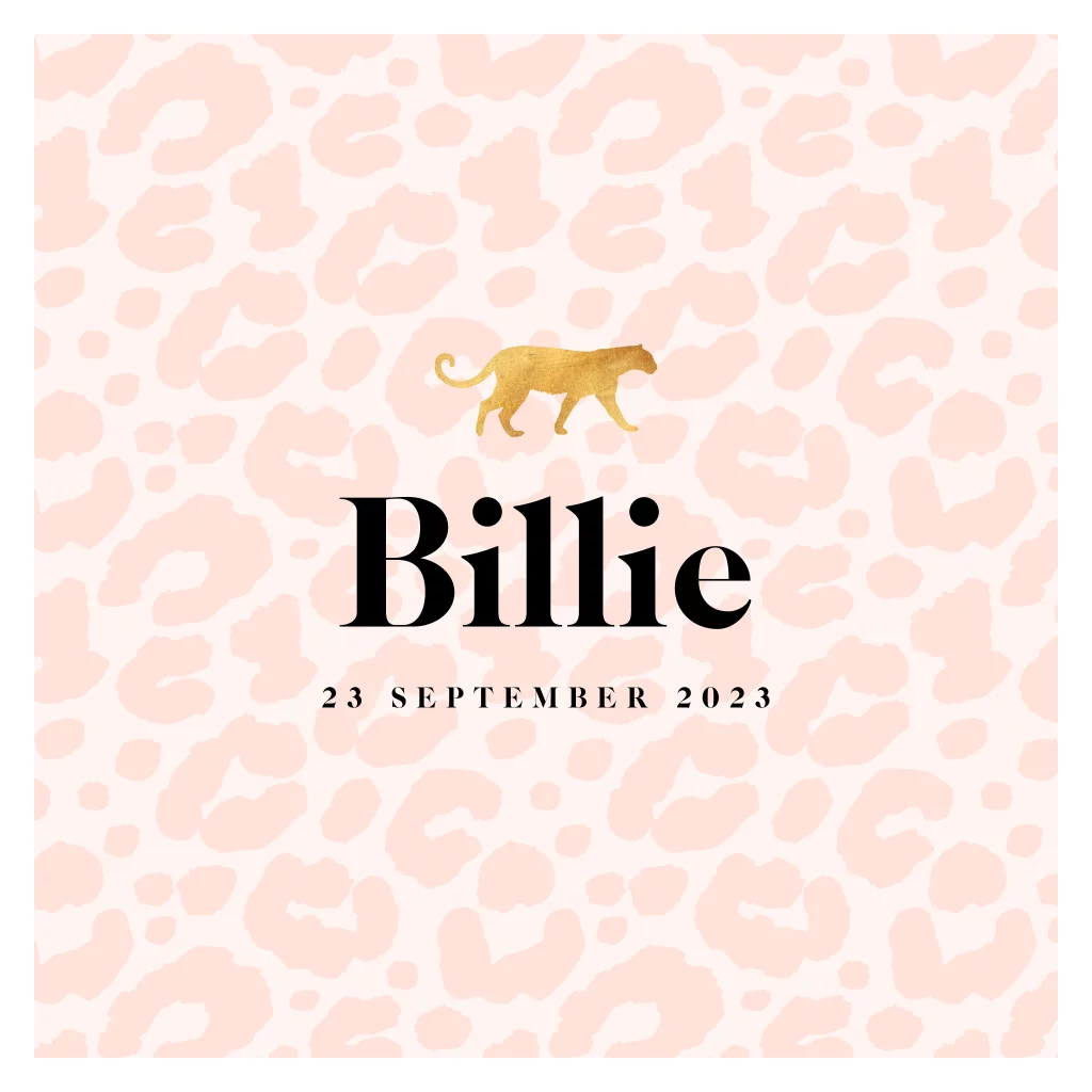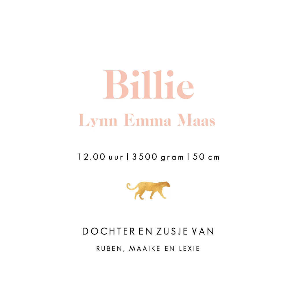 Gaaf babykaartje meisje met panter in goudlook. Wil je dit kaartje met echte goudfolie stuur ons dan een e-mail. Samen met Lizet Greve hebben we dit originele geboortekaartje ontworpen.