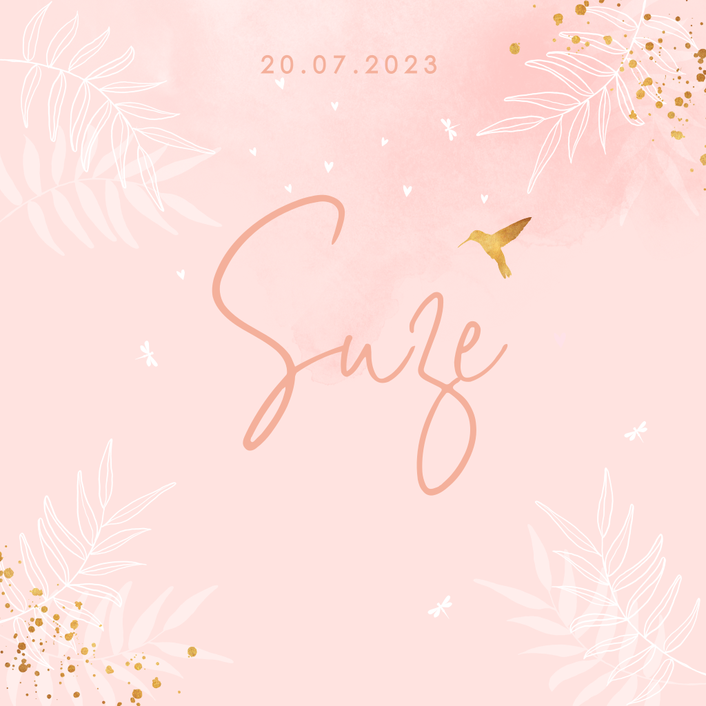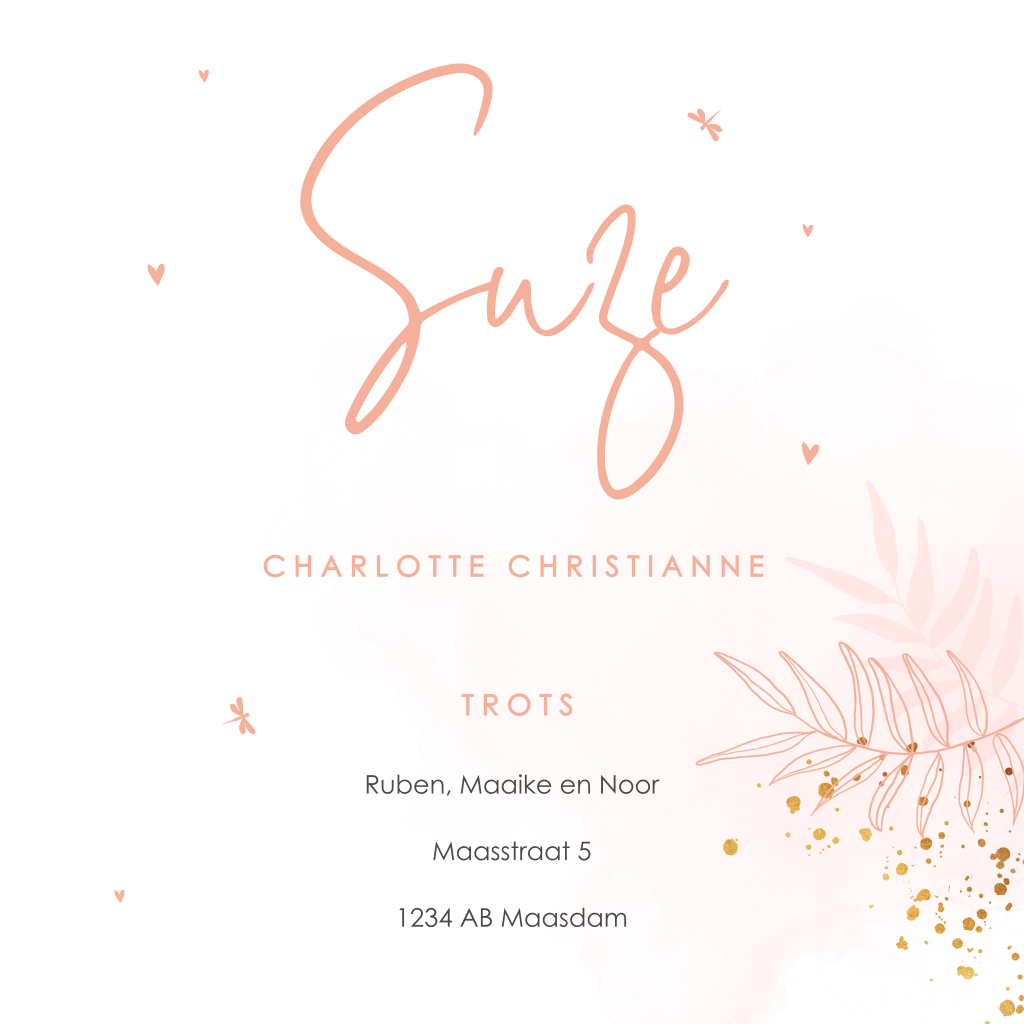 Een stijlvol en trend babykaartje meisje in peach met een botanische touch. Kleine blaadjes in wit outline, een libelle, wat goudlook spetters en een kolibri. Prachtig op parelmoer papier en met een gouden envelop maak je helemaal compleet.
