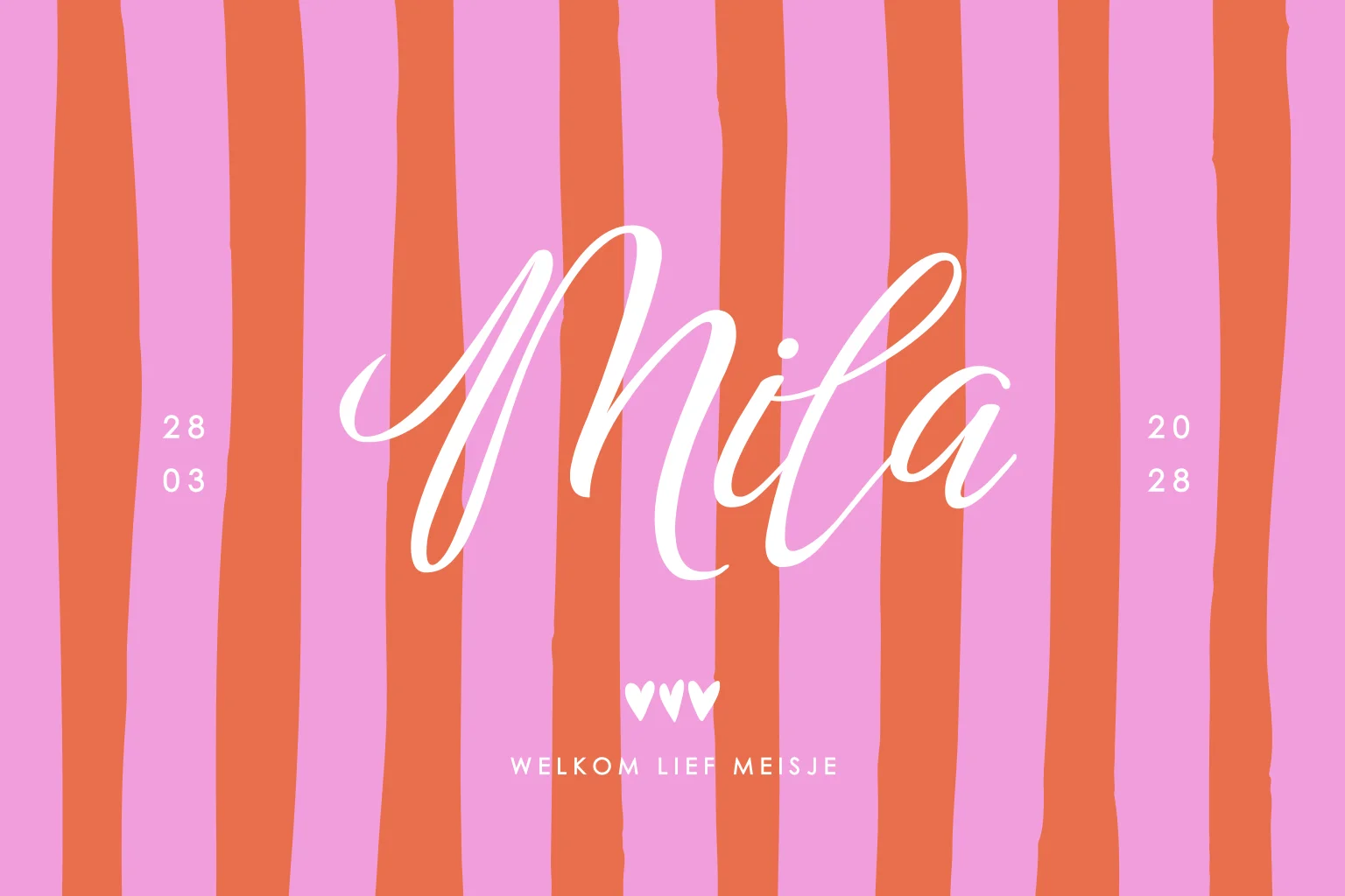 Een super trendy geboortekaartje voor jullie dochter! De felgekleurde strepen maken deze kaart extra origineel. Pas gemakkelijk kleuren, lettertypes en andere elementen aan met de online editor.