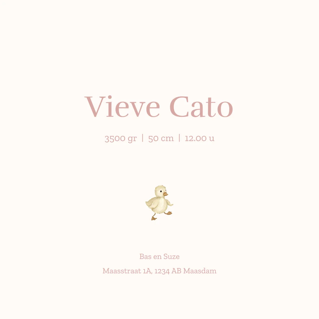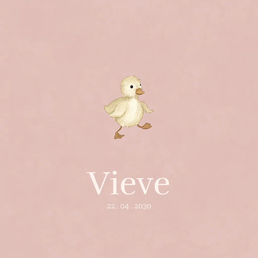 Hoe lief is dit roze geboortekaartje? Kies voor jullie kleintje een lief geboortekaartje met schattig eendje en maak het helemaal eigen door de achtergrond aan te passen naar je eigen favoriete kleur.