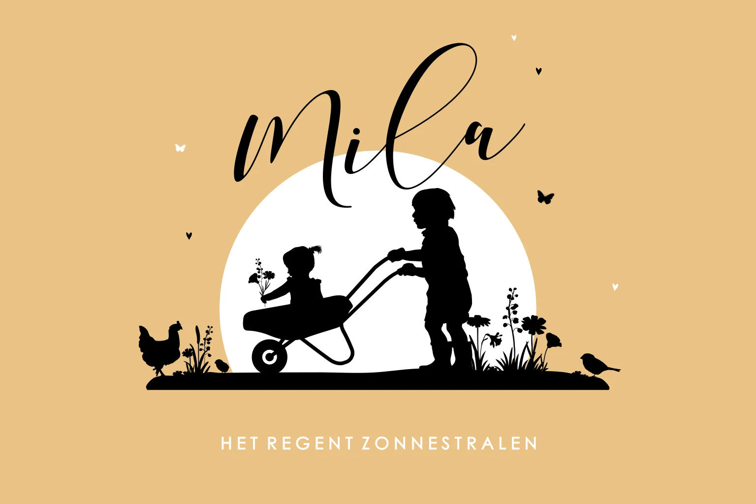 Lief kaartje geboorte meisje. Leuk om zo met silhouetten de uitbreiding van je gezin vorm te geven. De kip, de bloemetjes, vlinder en vogel geven de kaart een gevoel van voorjaar en zomer. Leuk detail: alle elementen staan 'los' op het kaartje. Zo maak je eenvoudig een uniek ontwerp. Pak het kaartje op. Kies je favoriete kleur, lettertype en pas de teksten aan. In de beeldbank vind je nog meer silhouetjes.