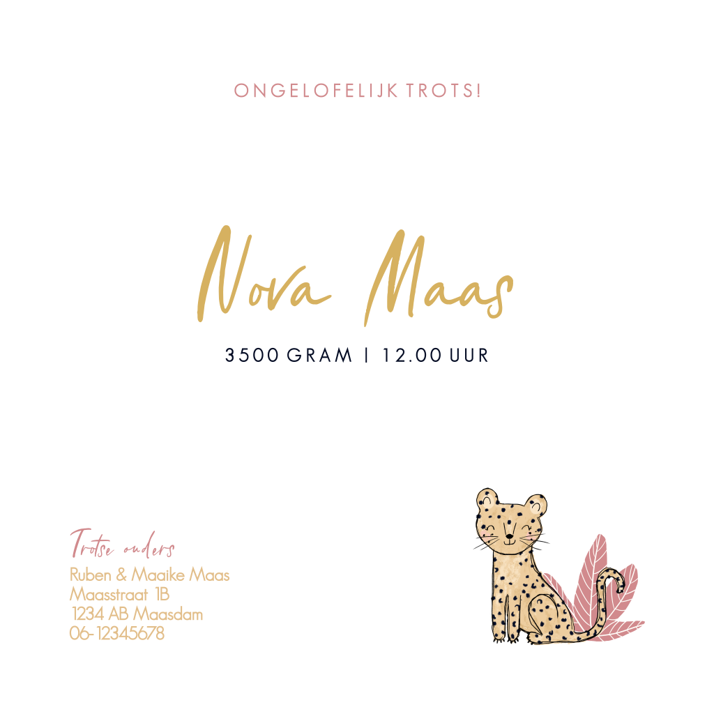 Een prachtig kaartje met unieke elementen gemaakt door onze vormgevers. Een avontuurlijk kaartje met een stoer pantertje. Kies voor de papiersoort parelmoer voor een luxe uitstraling.