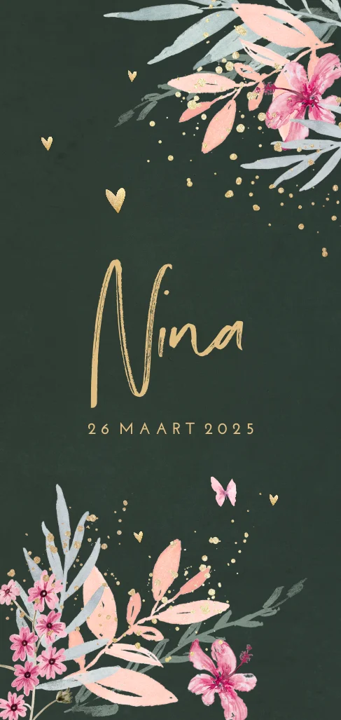 Lief en stoer geboortekaartje voor een meisje. De combinatie van de donkergroene achtergrond en vrolijke watercolour takjes, bloemetjes en vlinders maken het kaartje lief en stoer tegelijk. Wist je dat dit kaartje ook heel mooi is i.c.m. echt goudfolie? Dit kan je gemakkelijk zelf toepassen bij kleuren in de editor.