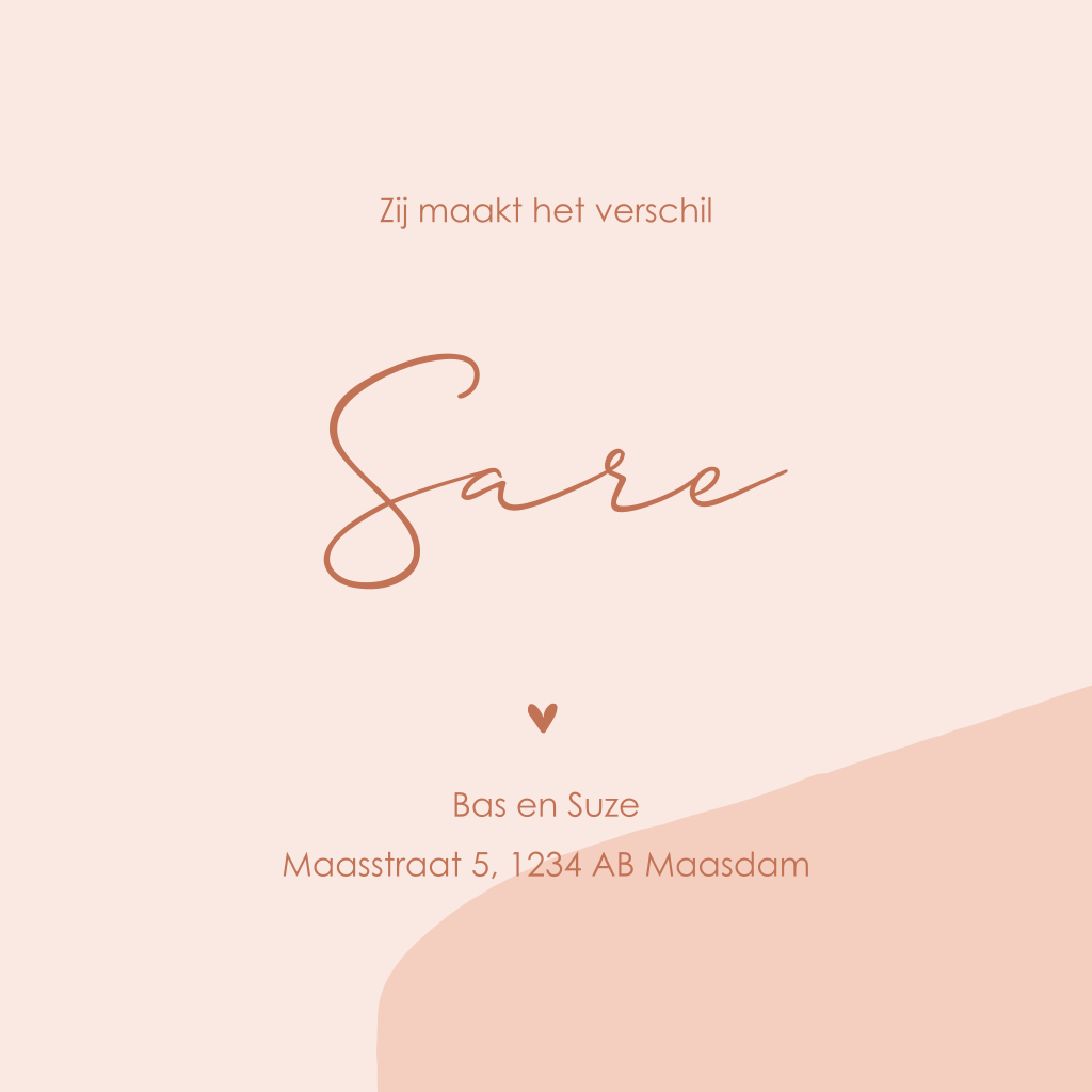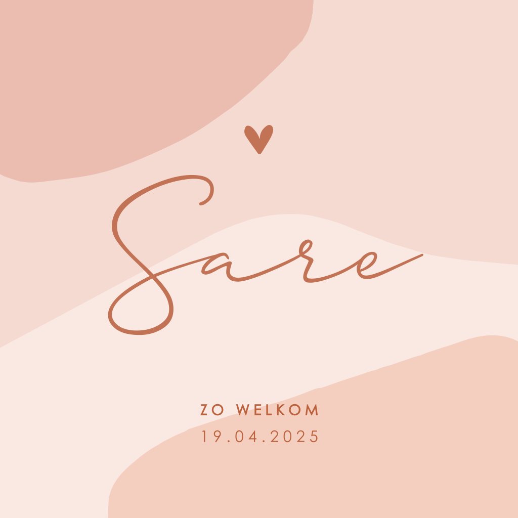 Lief en schattig geboortekaartje voor een meisje. Doordat de zachte roze kleuren in wat grovere vormen op de achtergrond te zien zijn, komt het kaartje vlot over. Wist je dat dit kaartje ook heel mooi is i.c.m. rosefolie? Dit kan je gemakkelijk zelf toepassen bij kleuren in de editor.