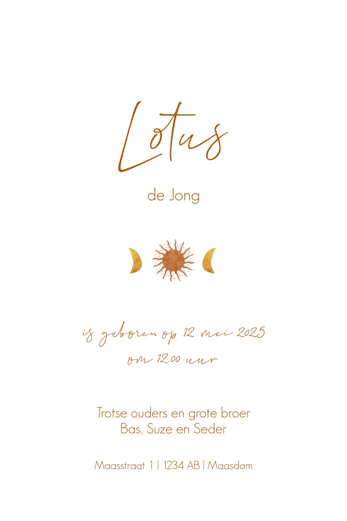 Ga voor bijzonder en kies voor een geboortekaartje uit onze Lief Leven collectie waarbij de zon en de maan de hoofdrol spelen. Pas het lettertype aan en voeg foliedruk toe om het kaartje helemaal eigen te maken.