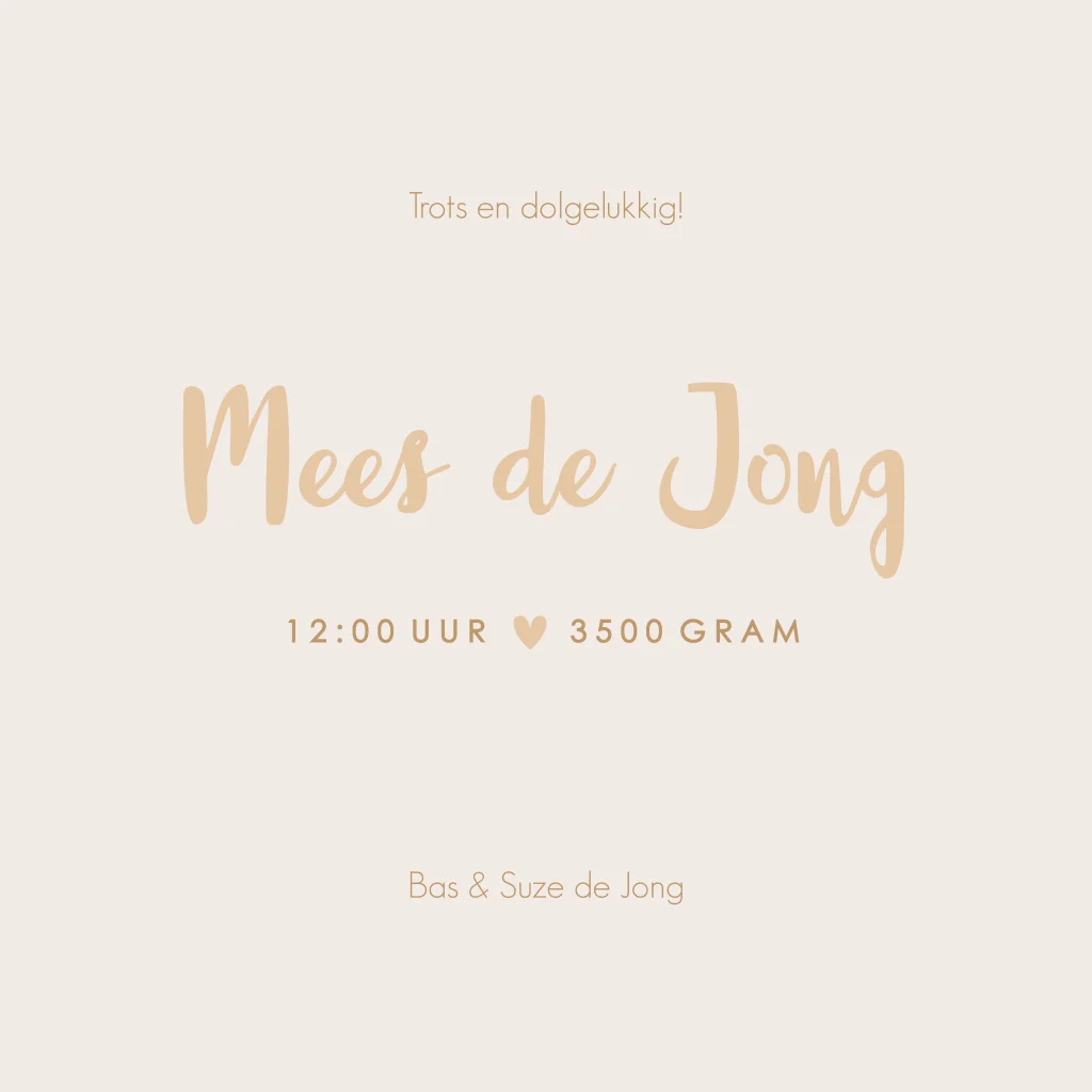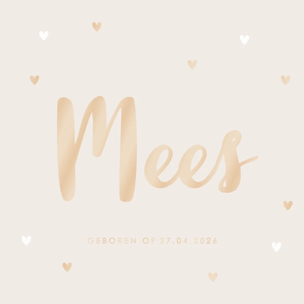 Lief en romantisch geboortekaartje waarbij de naam centraal staat. Wij hebben gekozen voor hoogglans folie in een nude tint, liever een andere kleur? Dit kun je heel gemakkelijk zelf aanpassen!