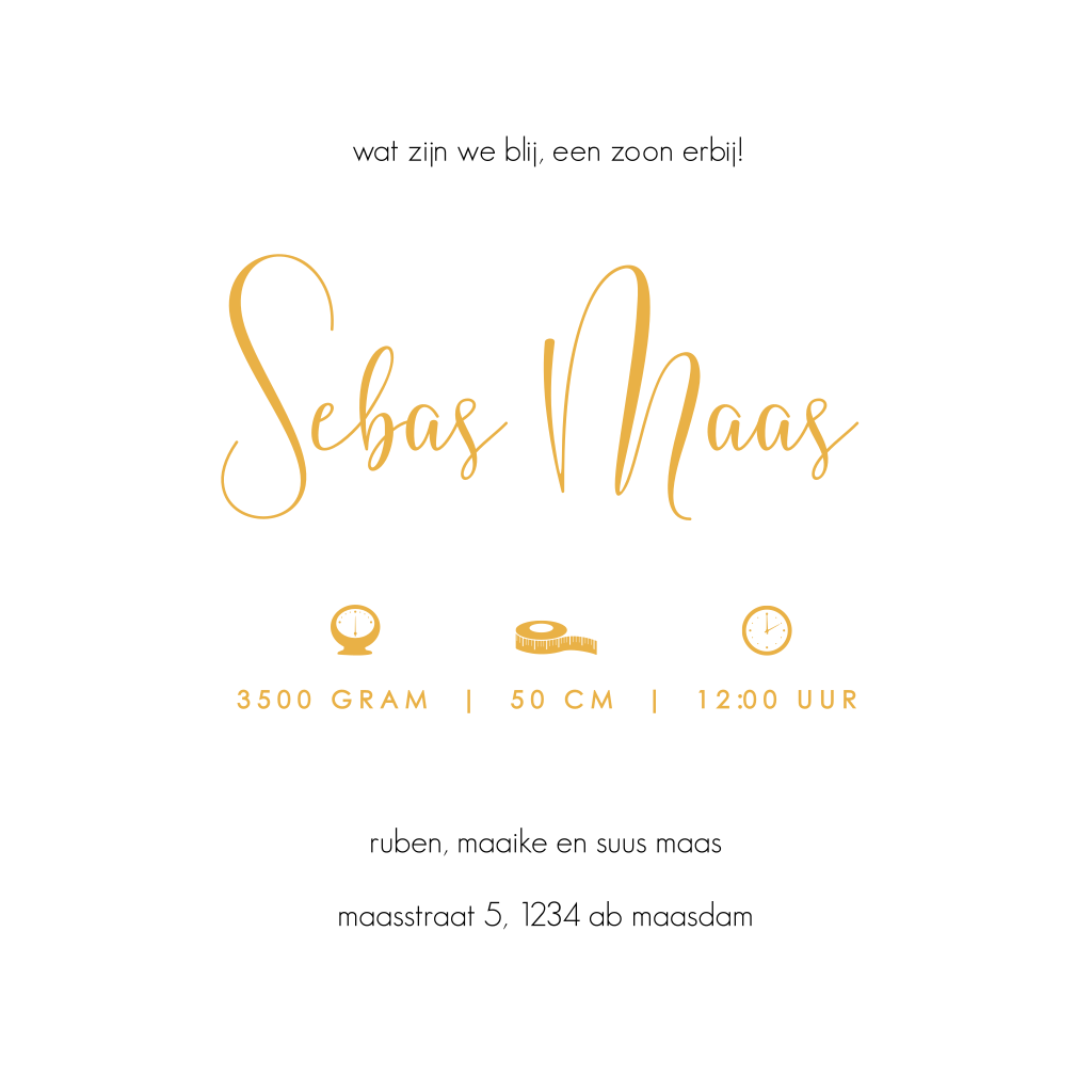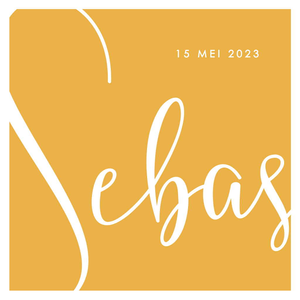 Een clean kaartje okergeel met groot de naam van je kleine uk. Met je favoriete naam en letterfont maak je een uniek geboortekaartje zoon.