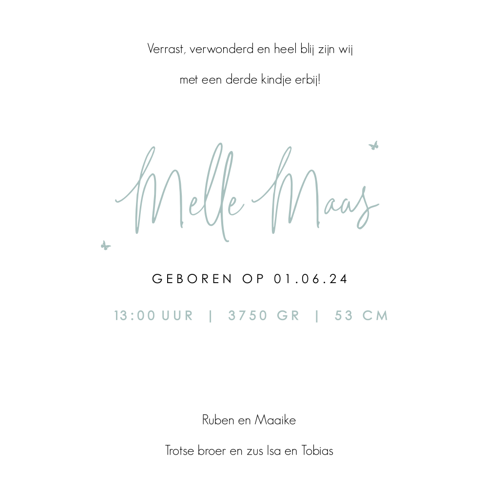 Hip en prachtig kaartje silhouet. Het babykaartje vertelt het verhaal van een trotse broer en zus die een broertje hebben gekregen. Wij hebben gekozen voor deze trendkleur, maar maak het ontwerp uniek met je favoriete kleur.