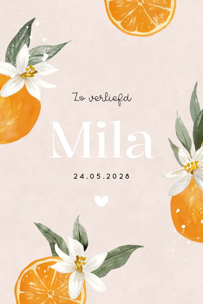 Wat een zoet geboortekaartje! Vier de geboorte van jullie kleintje met dit zomerse geboortekaartje met handgeschilderde sinaasappeltjes en goudfolie naam.
