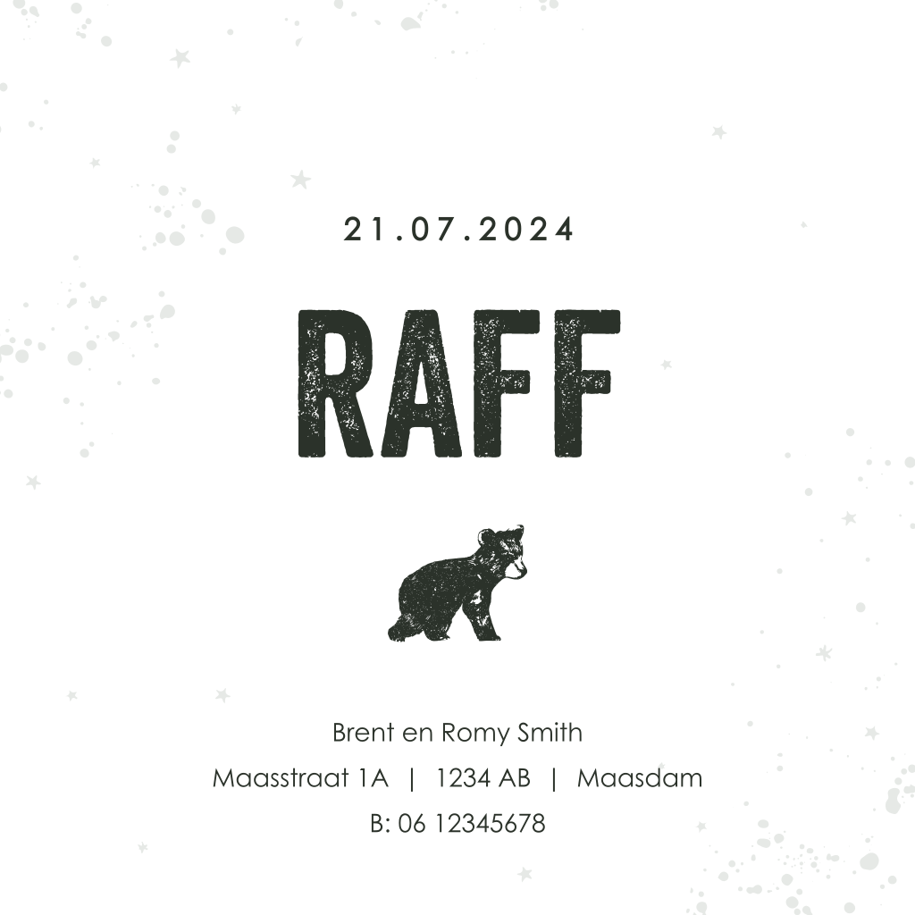 Kies voor jullie kleintje een stoer geboortekaartje met foliedruk en een beertje. Liever een ander diertje? Dit pas je gemakkelijk zelf aan in de editor!