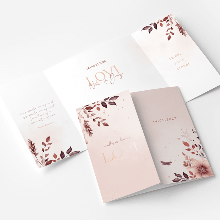 Geboortekaartje met theatervouw, bloemen en roséfolie