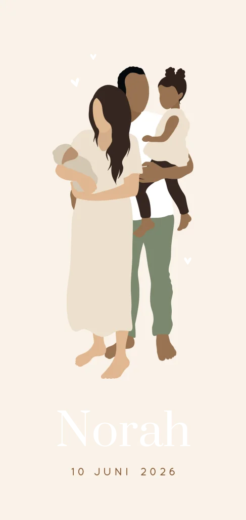 Bij de geboorte van jullie kleintje, hoort een speciaal geboortekaartje. Wat dacht je van dit kaartje met faceless portretten? Zo leuk! Kleuren en haren passen we kosteloos voor je aan. Wil je liever een eigen persoonlijke illustratie? Vraag een illustratie op maat aan via onze studio pagina.