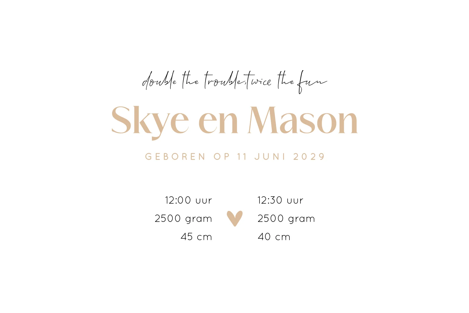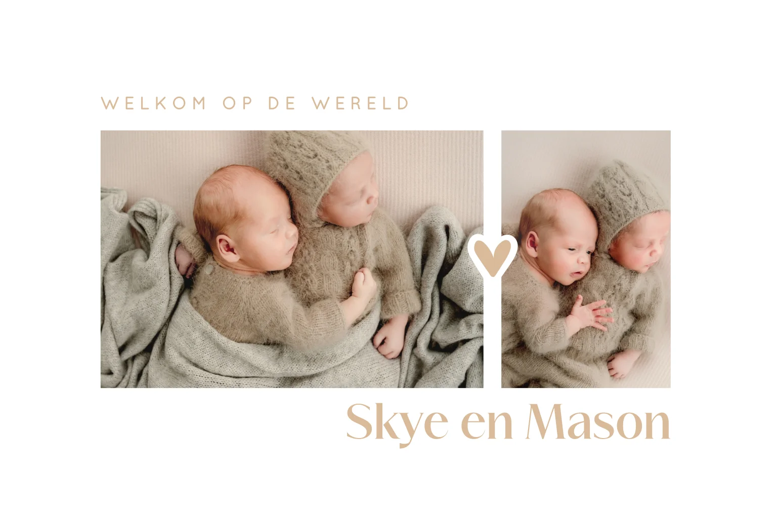 Lief geboortekaartje met twee foto's op de voorkant en een lief hartje ertussen, de tekst staat in hoogglans. Upload de mooiste foto van jullie tweeling in de online editor en maak zo een uniek geboortekaartje.