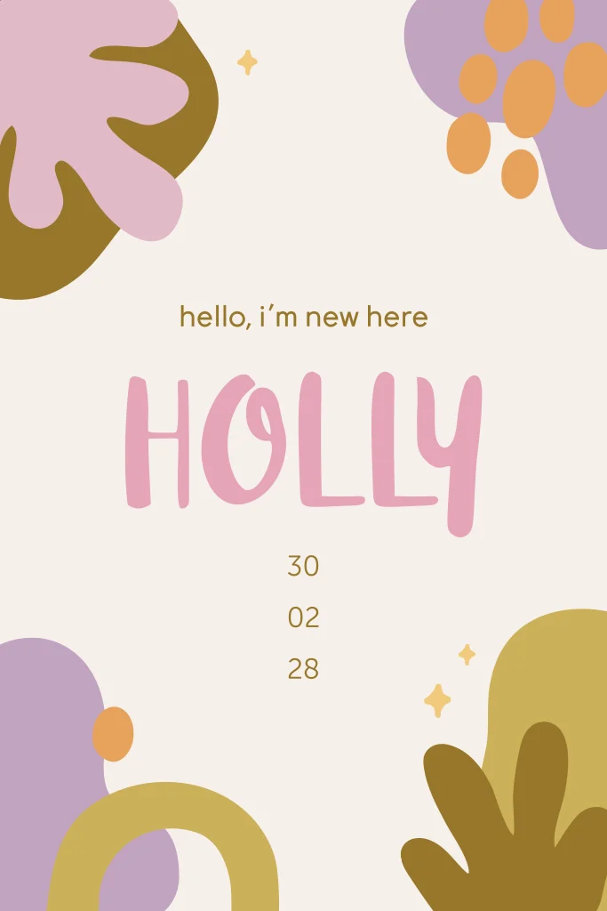 Kondig de geboorte van jullie kleintje aan met dit speelse geboortekaartje met organische vormen in vrolijke kleuren! Je past gemakkelijk de teksten, kleuren en lettertypes aan met de online editor.