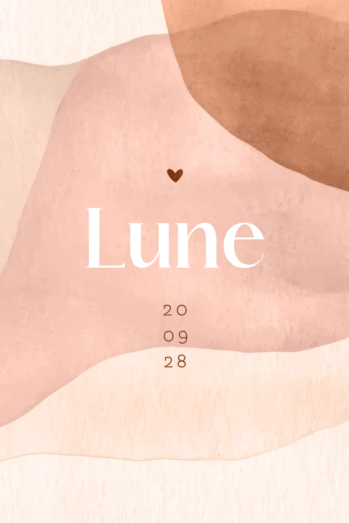 Een hip en stijlvol geboortekaartje met watercolour vlakken in verschillende aardetinten. De naam wordt gedrukt in koperfolie, dit heeft een prachtig effect!