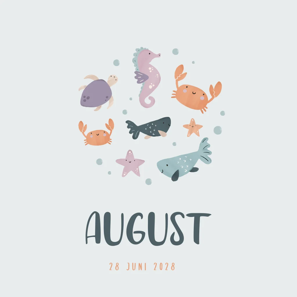 Kondig de geboorte van jullie kleintje aan met dit super zomerse geboortekaartje met verschillende zeedieren! Wil je een lettertype, kleur of ander element aanpassen? Dat kan gemakkelijk met de online editor.
