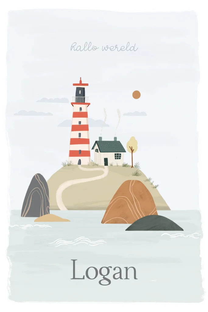 Op zoek naar een stoer geboortekaartje voor een jongen? Kies voor dit avontuurlijke maar klassieke ontwerp met een vuurtoren. Je past het ontwerp gemakkelijk naar wens aan in onze online editor. Wist je bijvoorbeeld dat het ook mogelijk is de letters en elementen in folie te drukken?