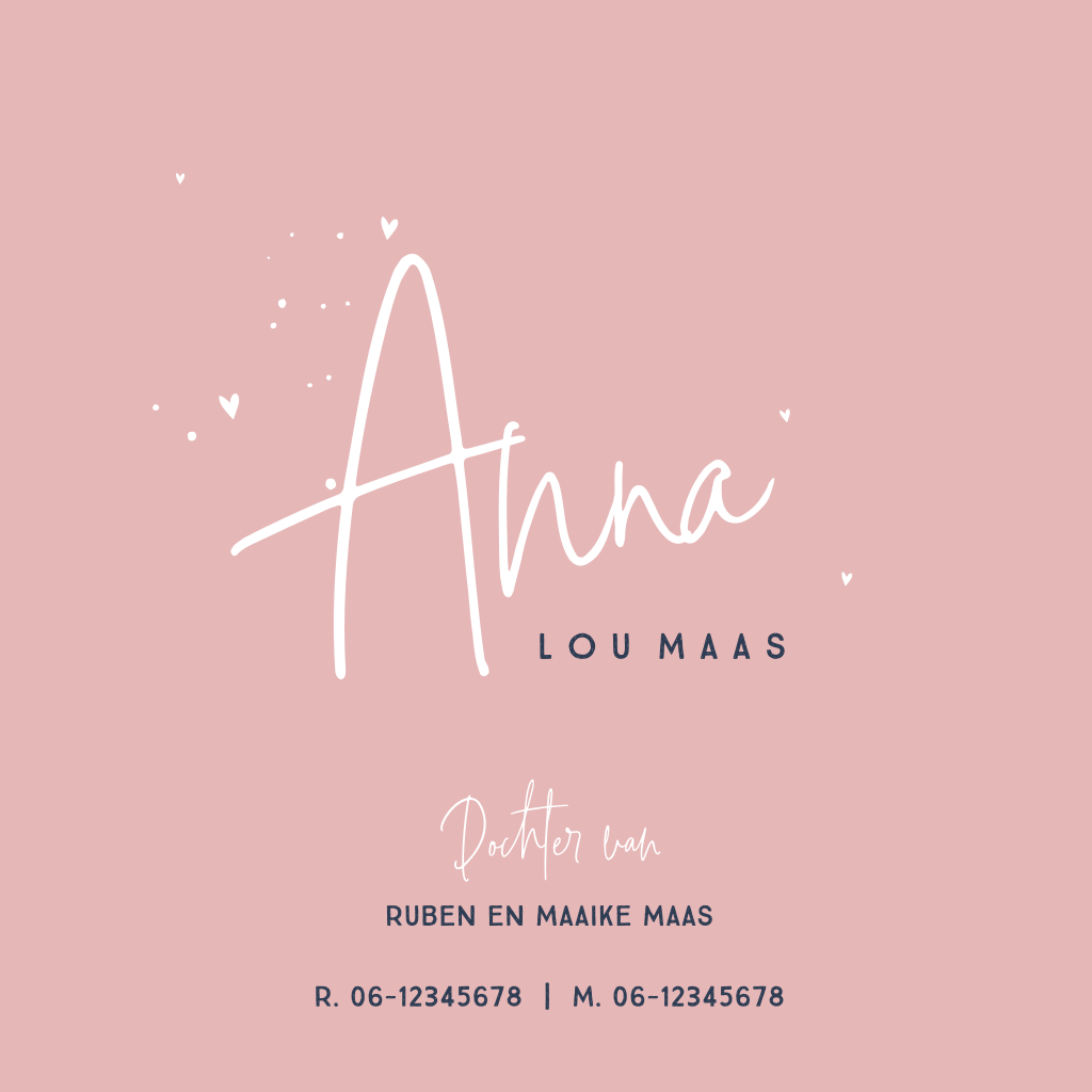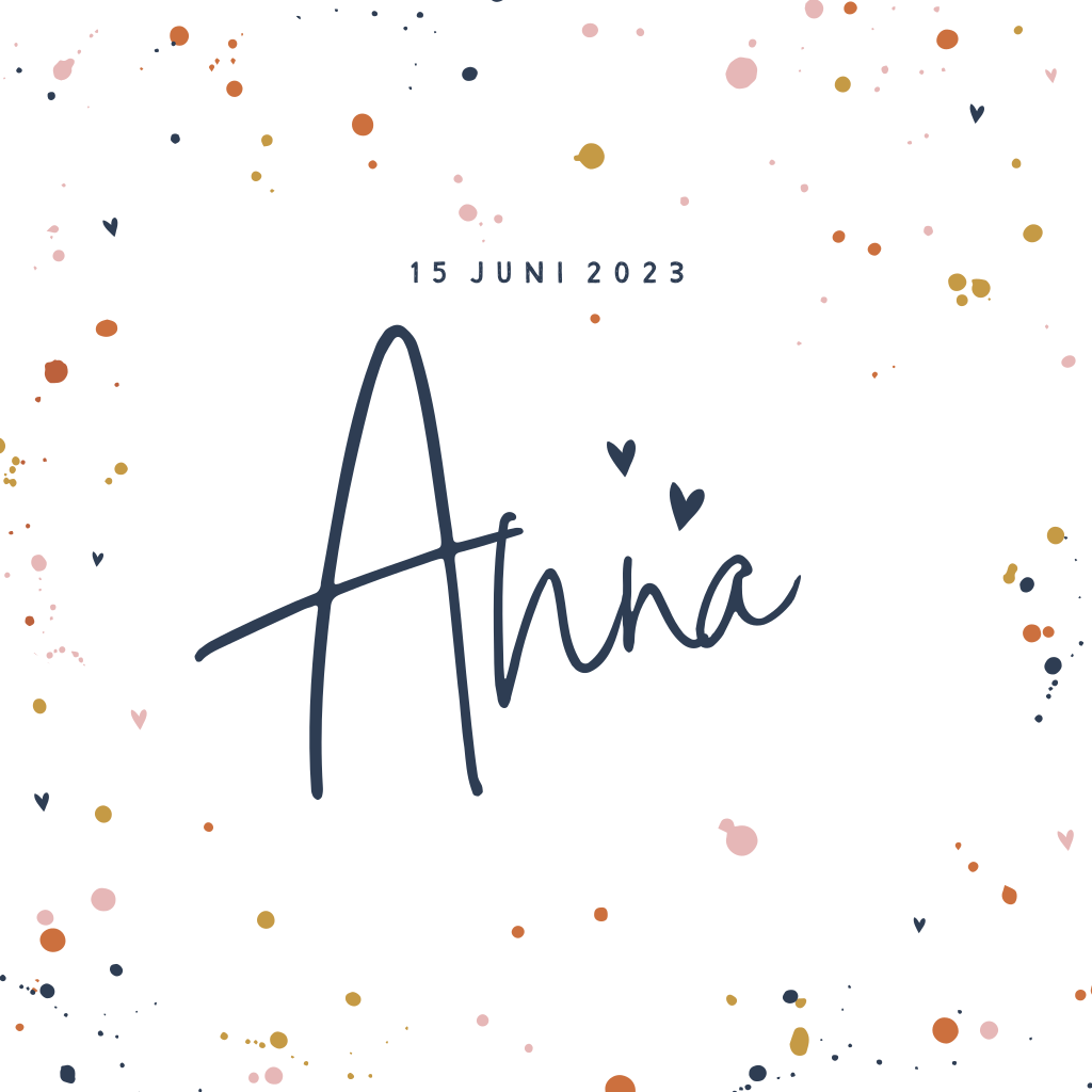 Een prachtig geboortekaartje met spetters in trendkleuren. De roze binnenzijde maakt dit kaartje extra schattig! Tips van onze makers: