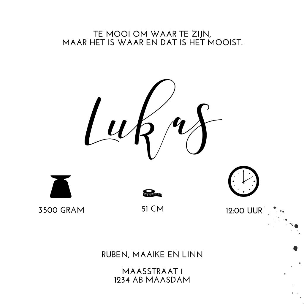 Een prachtig clean kaartje geboorte jongen volgens de laatste trend. Zwart-wit in combinatie met stijlvolle typografie. Mooi op oud-hollands papier met envelop lichtblauw.