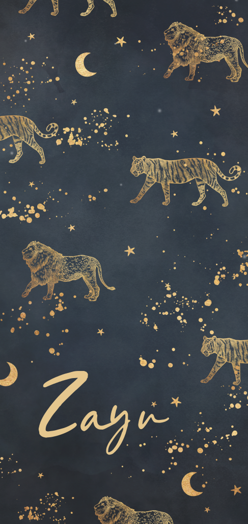 Een stoer en trend kaartje geboorte zoon met een patroon van een leeuw, tijger, maan en sterren. Kies je lettertype, plaats de tekst en maak eenvoudig een proefdruk. Weet je dat je dit design ook in andere formaten kunt verkrijgen? Wil je het kaartje in een ander formaat of dubbel? Heb je nog vragen? We helpen je graag!