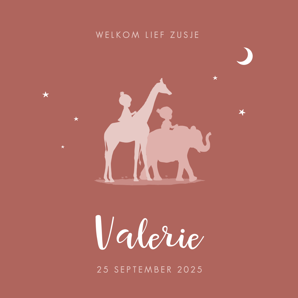 Een heel bijzonder geboortekaartje voor een klein zusje met een giraf en olifant. De rosegouden details maken het helemaal van nu! Dit avontuurlijke kaartje kan je naar wens bewerken in de editor.
